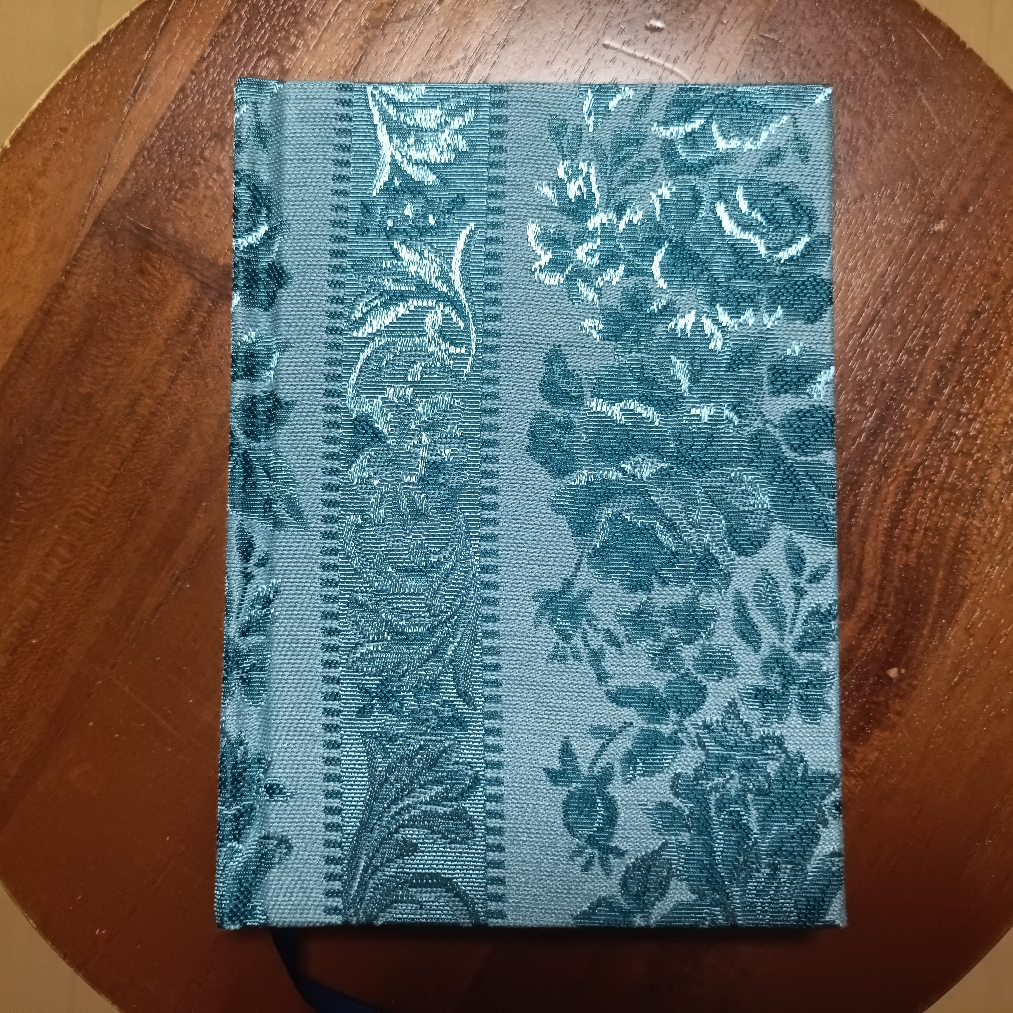 ブルーグレーのシックかつ洒落感溢れる独特な色合いと、そこに浮かぶローズの優雅な織り柄が美しい生地を用いた、テルコ雑貨店オリジナル・A6サイズのハードカバーノート、無地バージョンです。